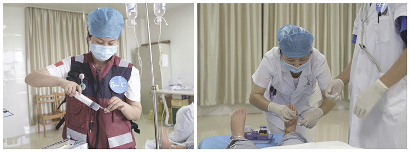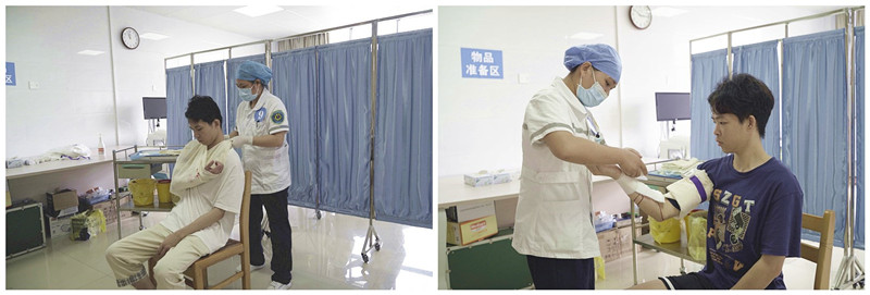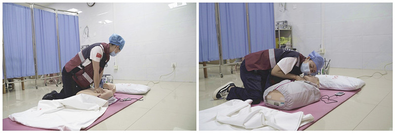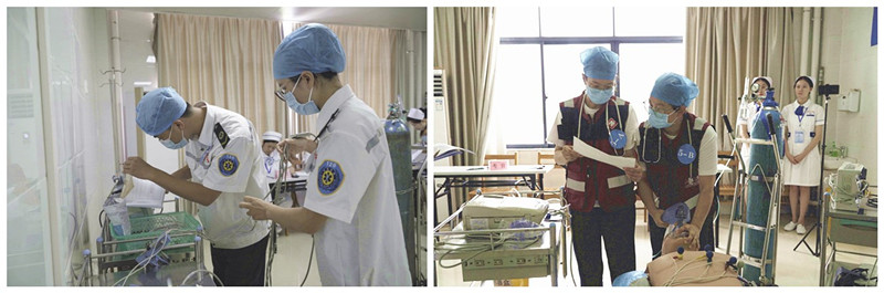 9点,综合笔试在学术报告厅进行。笔试后,各参赛队伍移步教学楼五楼进行基本技能操作和综合情景模拟考核。12支参赛队伍分别选派3位选手参加比赛,基本技能操作为赛站式,项目包括止血包扎、单人心肺复苏及气管插管术三个项目;综合情景模拟考核由三名队员以团队形式参加,在规定时间内根据提供的情境进行应急处置。