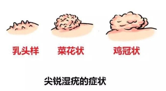皮损初起为单个或多个散在的淡红色小丘疹,质地柔软,顶端尖锐,后渐增多增大,依疣体形态可分为无柄型(即丘疹样皮损)和有柄型,后者可呈乳头状、菜花状、鸡冠状及覃样状;疣体常呈白色、粉红色或污灰色,表面易发生糜烂,有渗液、浸渍及破溃,尚可合并出血及感染。多数患者无明显自觉症状,少数可有异物感、灼痛、刺痒或性交不适。少数患者疣体过度增生成为巨大型尖锐湿疣,常与HPV-6型感染有关,部分可发生恶变。