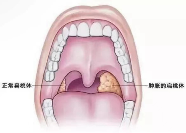 如图所示,发病的扁桃体、腺样体明显比正常的大,占据口咽部大部分面积,影响儿童正常呼吸,常见的是打呼噜,往往伴有憋气、睡觉不安等。对听力产生影响:并发分泌性中耳炎,隐匿出现耳闷、耳聋,影响言语发育、听课效果。另外,反复长期张口呼吸,还会导致牙列不齐、颌面畸形,即腺样体面容,影响儿童身高、智力发育等。