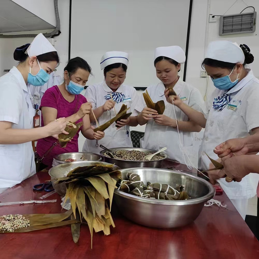 为了让病房里的糖友们能和大家一起共度中国的传统佳节---端午节,广科大一附院内分泌科医生护士们,在端午节前召集了病房里的糖友们进行了一次包粽子活动,活动中精心准备了适宜糖友吃的杂粮粽材料:有黑米、小米、荞麦、红豆、绿豆、花豆、糯米等,按照比例配好。活动中糖友们变成了医护人员的老师,大家认真跟老师们学习各种粽子的包法:有三角粽、四角粽、枕头粽、有手掌粽、还有圆筒粽。一场包粽子活动,让我们度过了难忘的端午。