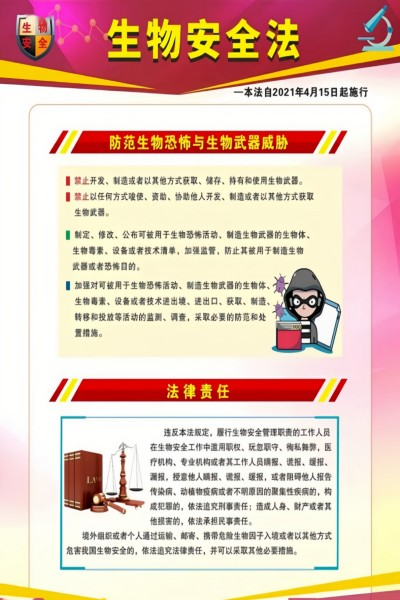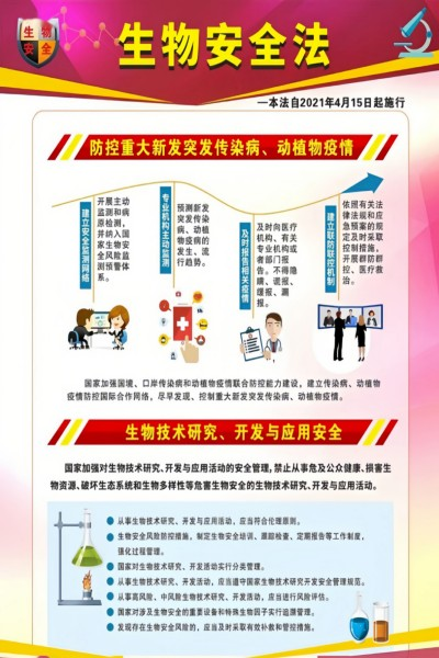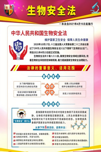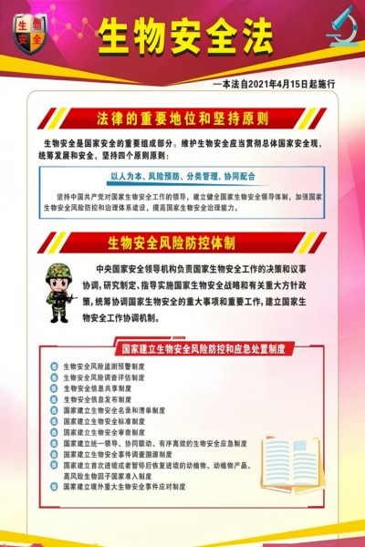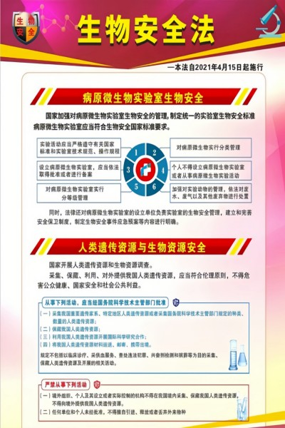 《中华人民共和国生物安全法》于2020年10月17日第十三届全国人大常委会第二十二次会议通过,自2021年4月15日起正式实施,共十章八十八条,聚焦生物安全领域主要风险,完善生物安全风险防控体制机制,着力提高国家生物安全治理能