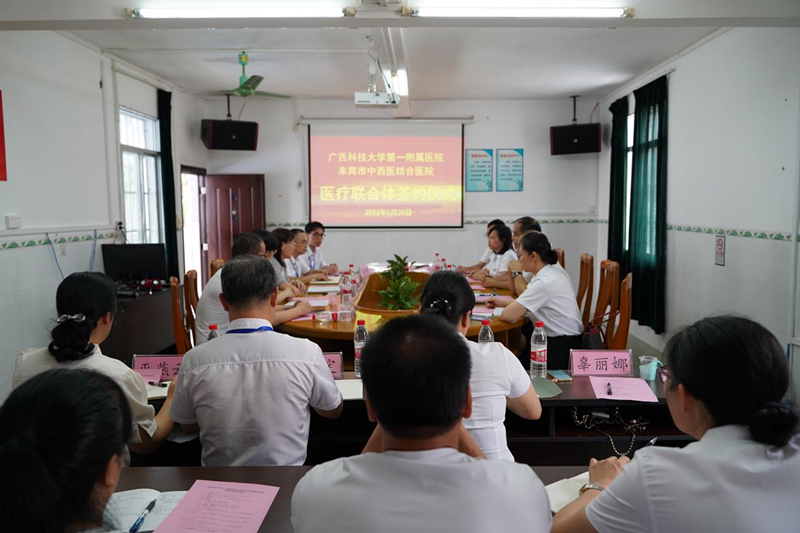 6月20日,广西科技大学第一附属医院与来宾市中西医结合医院举行了签约仪式暨医联体交流会。来宾市卫健委、广西科技大学第一附属医院、来宾市中西医结合医院等单位领导、双方单位相关科室负责人等近20多人出席仪式及会议,来宾市卫健委副主任马晓伟主持了当天的会议。