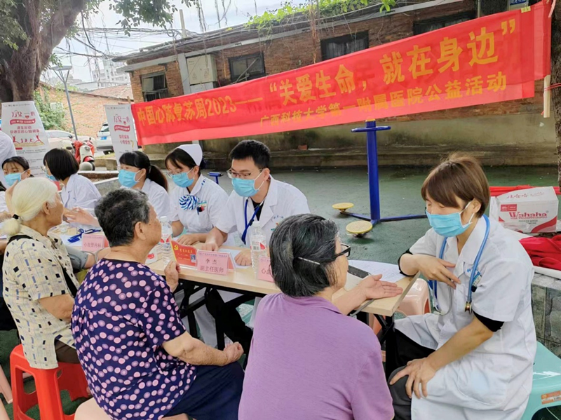 6月8日,李杰副主任带领心内科韦鲜丽主治医生、韦飞住院医生来到广西冶金建设公司第二生活区义诊,向民众宣传急救意识,普及心肺复苏技能。医护团队还去到鲤鱼屯发放体检报告,同时为村里老人进行心肺复苏培训。