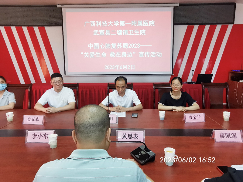 今年的心肺复苏周主题是“关爱生命,救在身边”。2023年6月2日,张施明副院长带领广西科技大学第一附属医院胸痛中心来到武宣县二塘镇卫生院进行2023年中国心肺复苏周宣传活动,呼吁基层单位一同加强对民众的心肺复苏科普培训工作。活动中,张施明副院长对高危胸痛疾病的诊断、救治方法及要点进行详细介绍,农宝兰护士长向大家讲解心肺复苏的科普知识。