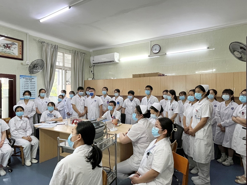 “有没有还不会使用除颤仪的同学?”为了更好的普及急救知识,李杰副主任于6月7日在心血管内科办公室对在场医务人员、学生进行心肺复苏、除颤仪的使用培训。“有些医务人员即便工作多年也没用过除颤仪,一到真正抢救的时候手忙脚乱。”经过李主任深度解析,在场所有人都很好地记住了心肺复苏及除颤仪的操作方法。