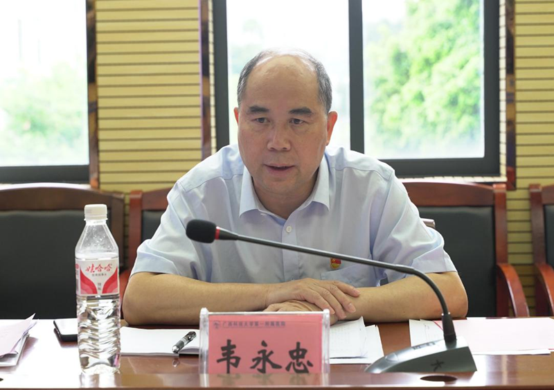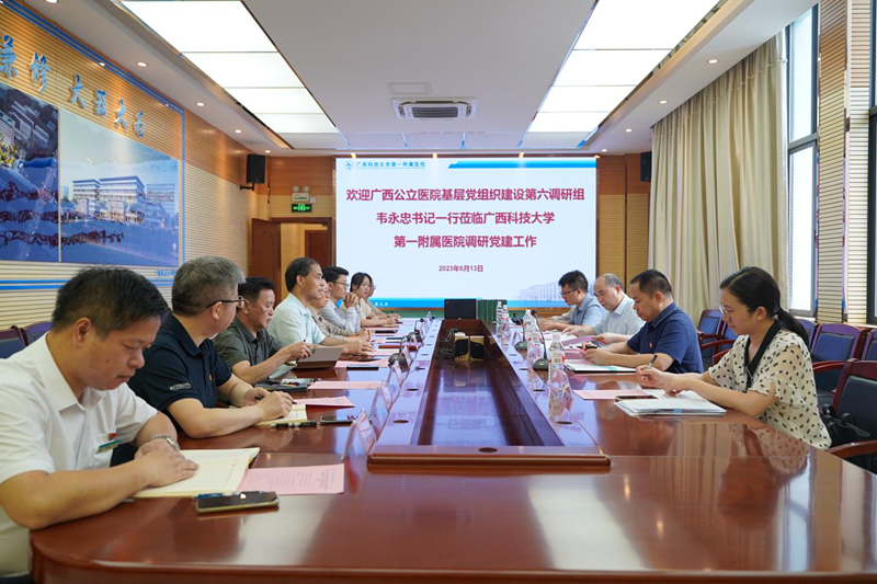 韦永忠代表调研组说明来意,指出调研要求:根据工作部署,此次到广西科技大学第一附属院调研,主要围绕公立医院党建质量评价体系和评价标准构建、党建与业务相融合、对党员的关心关爱措施、民主评议党员的做法和结果运用、党支部参与科室重大问题决策情况等方面,了解党建工作遇到的困难,收集好的经验做法。