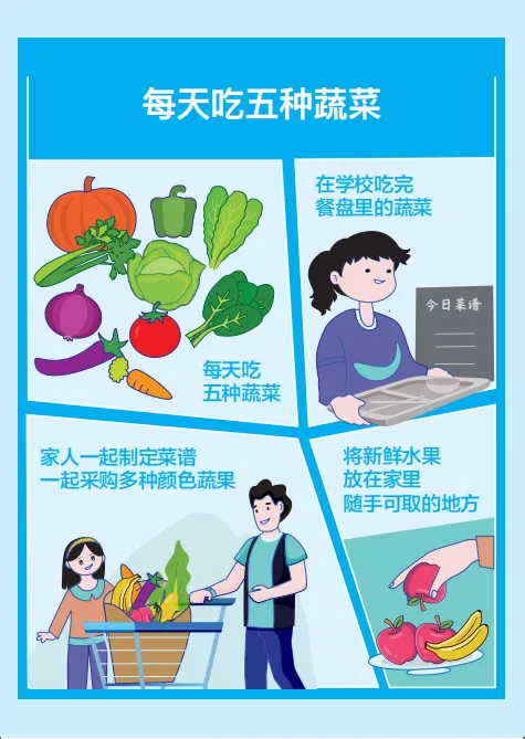 (一)食物多样,满足生长发育需要。每餐要包括谷薯类、蔬菜水果、畜禽鱼蛋、奶和大豆等食物中的3类及以上。每天食物种类达到12种以上,每周25种以上。适当增加瘦肉、水产品、禽类、蛋类、大豆等富含优质蛋白质的食物,多吃新鲜蔬菜水果。