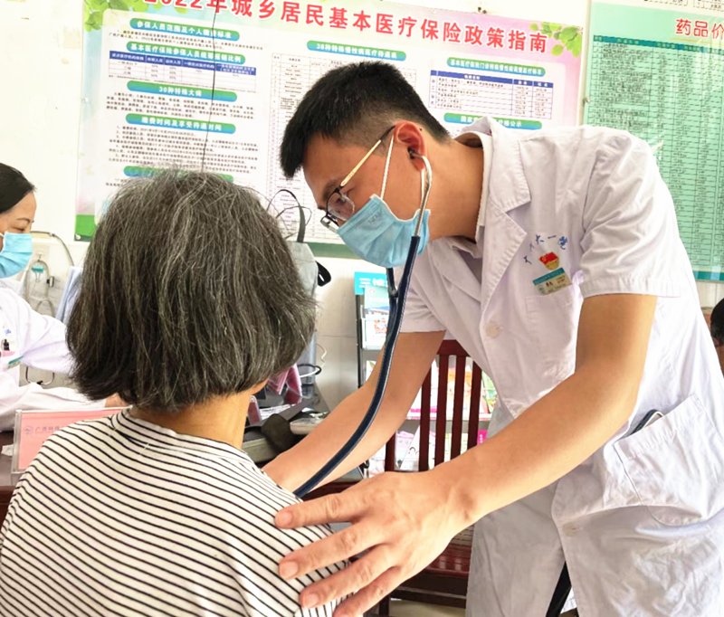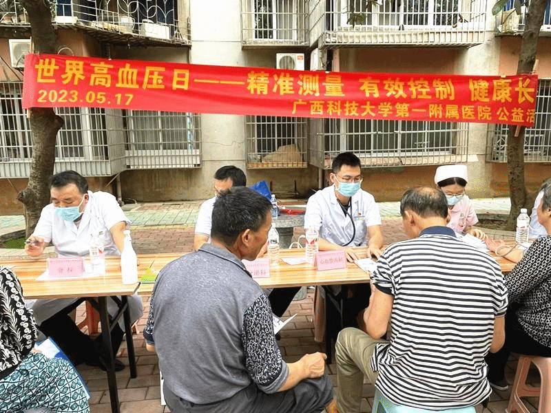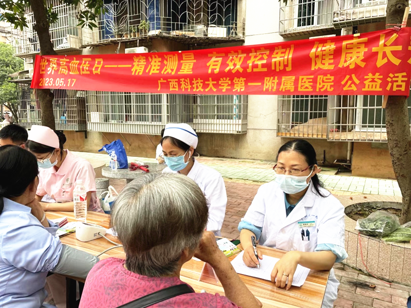 2023年5月17日第19个“世界高血压日”之际,心血管内科李杰副主任医师带领广西科技大学第一附属医院心内科的医务人员们在南雀新村(雀儿山公园西门)为群众开展义诊活动。李杰副主任医师、蒙莫珂副主任医师、农宝兰护士长等为前来就诊的群众监测血压,将高血压患者登记备案以便随访,同时耐心讲解高血压病的科普知识及最新指南上的治疗方案。