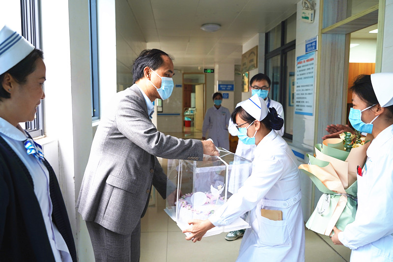 院领导们手捧献花和蛋糕,来到各临床科室,与奋战在一线的护理人员亲切交谈。送上最真诚的祝福,并对科室护理人员全力以赴做好护理工作,急病人之所急、想病人之所想,舍小家为大家、迎难而上表示感谢。希望大家持续开展“三心五度一微笑”优质护理服务,不断丰富护理内涵,进一步提升护理队伍素质,使医院的护理事业更上一层楼。