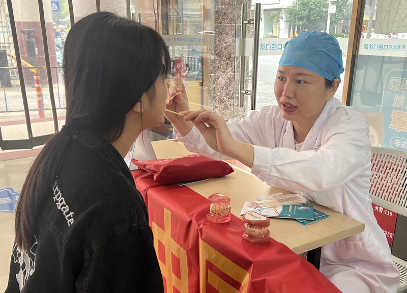 口腔门诊部负责人杨珍及肖亦芳副主任医师为群众进行现场口腔检查,并赠送口腔护理包