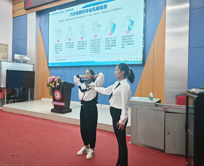 课程最后,心胸乳腺外科护士吴智亚通过图片及现场演绎,详细讲解了该如何进行乳腺健康自检,强调了女性进行乳房自检的步骤、手法和最佳时机,并在现场带领大家一起乳房自检,让大家对乳腺自检有了新的认识。
