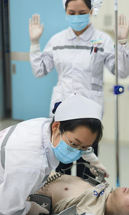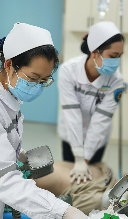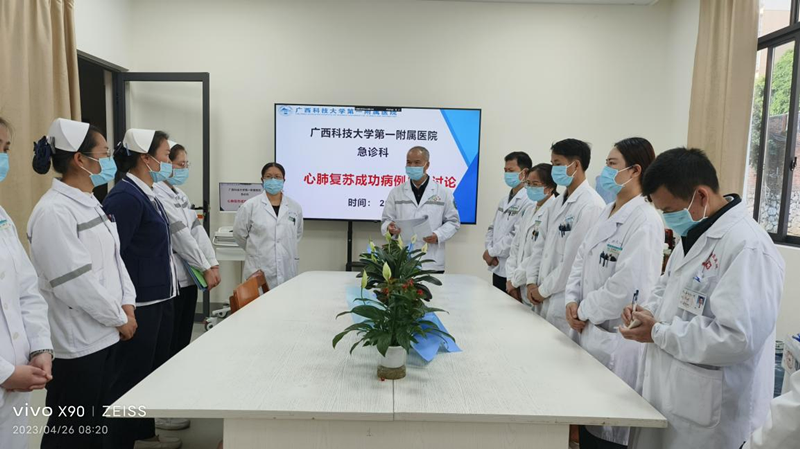 2023年4月24日傍晚19:05分,“滴铃......”,广西科技大学第一附属医院急诊科导诊台响起一阵阵急促的电话铃声。护师梁婵接完电话大声说:“我们出诊的120救护车司机打来电话,陈秋杏、洪凤洁他们正在救护车上进行心肺复苏,情况危急!”。就在这时,急诊科韦建革主任刚忙完手上的工作、脱下工作服准备下班,他习惯性来到急诊抢救室外,看看还有什么特殊病人需要处理。韦主任尽管已经很疲惫了,他一听有抢救又来了精神,吩咐大家做好抢救准备。19:07分,广西科技大学一附院急诊科出诊的救护车在急促警笛声中停在急诊门前,司机罗文华将车门打开,陈秋杏他们还在持续着心脏按压。早就待命的檀成主治医师、梁婵护师、冯素华护师与余永成进修医师马上迎上前,与车上的陈秋杏、小洪一道将病人快速转运进抢救室。“过床!胸外心脏按压!人工呼吸!重新连接心电!肾上腺素注射!建立第二条静脉通路!采动脉血血气分析!除颤!......”
