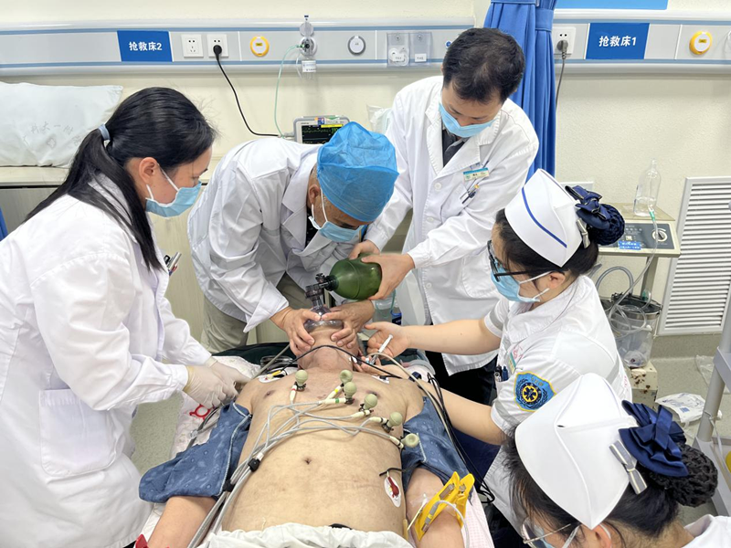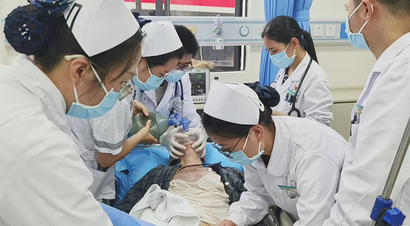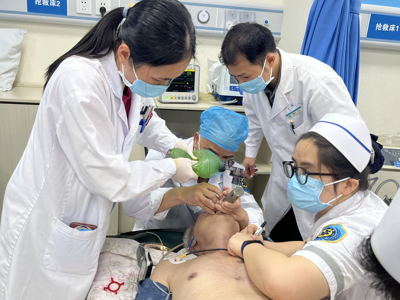 2023年3月30日中午14:20分,患者谢大爷,83岁。因为咳嗽气促3天,加重伴意识障碍30分钟,家人向120中心呼救。由急诊科吴广知主治医师、谭苏妮护师出诊。他们出诊到达患者家中1分钟左右,大爷心跳呼吸停止了。两位出诊医护人员就在大爷家中给予心肺复苏、人工呼吸及其它救治措施,经过20分钟的救治,大爷心跳恢复,呼吸恢复。回院后在急诊科开展系列救治趋于平稳,当日下午转重症医学科(ICU)进一步治疗,4月10日大爷完全清醒转出ICU到普通病区。