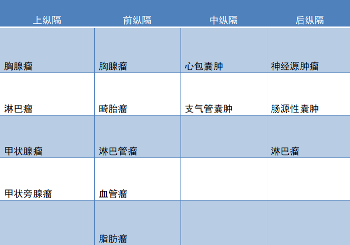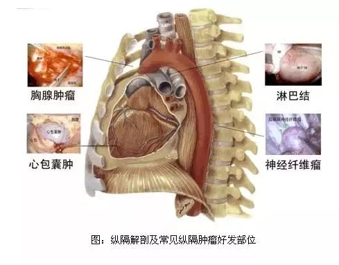 纵隔这个位置对许多人来说比较陌生,它不是器官,而是一个解剖的区域。认识纵膈肿瘤前我们应该知道纵隔在哪?纵隔实际上是一间隙,前为胸骨,后为胸椎,上连颈部,下止于隔肌,左右两肺之间,通俗的讲就是胸口中间的区域。纵隔内有心脏、大血管、食管、气管、神经、胸腺、胸导管、丰富的淋巴组织和脂肪结缔组织等等,纵隔是一个空间概念,指的是左右纵隔胸膜及其间所夹的器官和组织的总称,简单的说胸腔里左、右肺部中间的地方就是纵隔。而纵隔肿瘤,指的就是长在这个区域的新生物或囊肿。