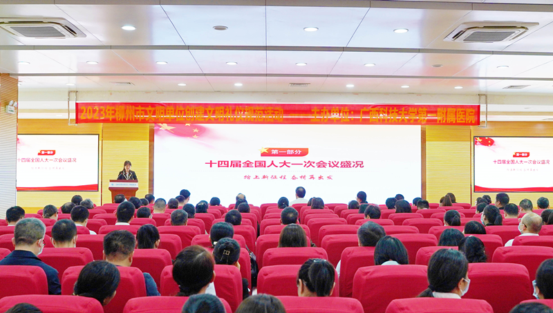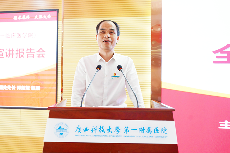 为学习贯彻习近平新时代中国特色社会主义思想,贯彻落实全国两会精神,4月14日下午,广西科技大学第一附属医院(第一临床医学院)召开全国两会精神专题宣讲报告会。报告会邀请到第十四届全国人大代表、广西科技大学科学研究管理处处长邓朗妮同志做两会精神宣讲报告会。医院(学院)领导班子成员、全体党支部书记、中层干部、护士长以及学生代表等参加了报告会。会议由医院(学院)党委书记庞晓红主持。