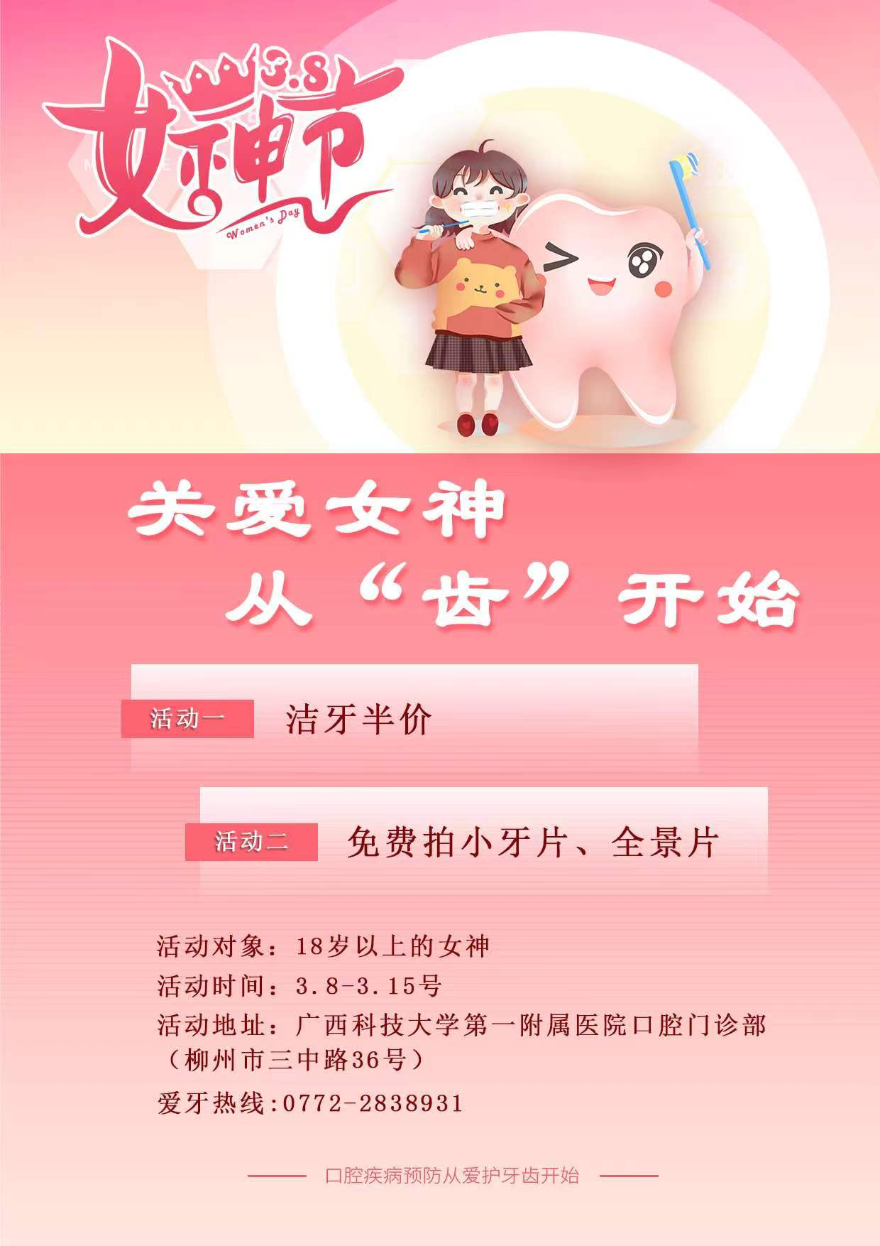 随着人们口腔保健意识不断增强,许多人都逐渐接受了“洗牙是一种必要且有效的口腔保健手段”的观念。我们身边的女性,如鲜花一般值得呵护。在“3.8”国际妇女节到来之际,广西科技大学第一附属医院口腔门诊部开展“关爱女神,从齿开始”特惠活动,活动内容如下: