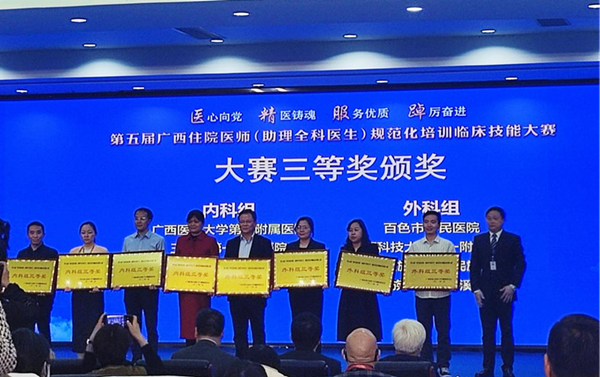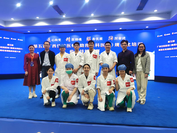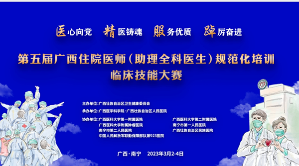 第五届广西住院医师(助理全科医生)规范化培训临床技能竞赛,于2023年3月2-4日在广西壮族自治区人民医院举行。本次竞赛由自治区卫生健康委主办,广西壮族自治区人民医院承办。来自全区26个住培基地、27个助理全科医生培训基地,共101支参赛队伍参加了比赛。其中内科组23队、外科组25队、全科组26队、助理全科27队。大赛的主题是“医心向党,精医铸魂,服务优质,踔厉奋进”。竞赛共设一等奖2名,二等奖2名,三等奖4名。