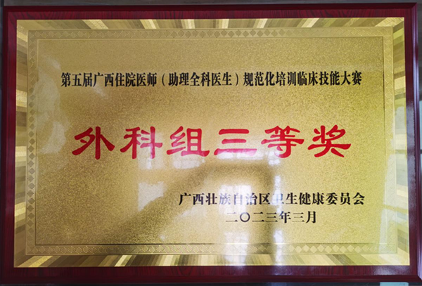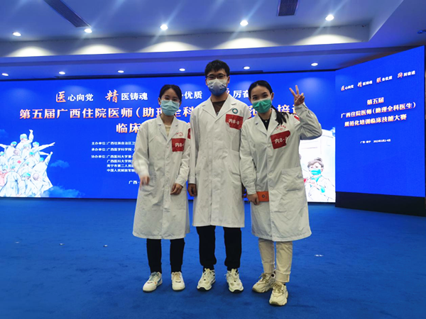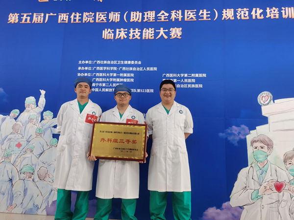 我院外科组的三位学员黄麟贵、黄一堃、陈允奇与来自广西25家住培基地的外科组队员同台竞技,在历经三天医学理论和临床技能的大比拼后脱颖而出,挺进了决赛!总成绩排名第六,荣获本届外科组三等奖!这是我院在广西住培临床技能竞赛中继2019年第二届获二等奖、2020年第三届获三等奖之后的又一次获奖!全科组及内科组虽然没有进入决赛,但从比赛成绩可以看出,队员们也获得了很大的进步!