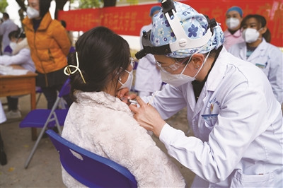 广西科大一附院医护人员在公益活动现场为出现喉咙肿痛的学生进行治疗
