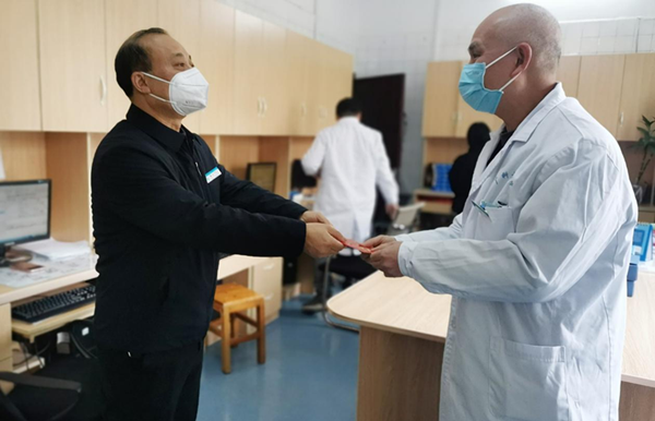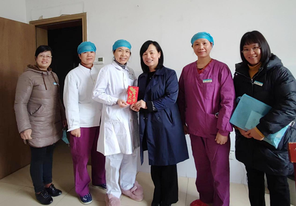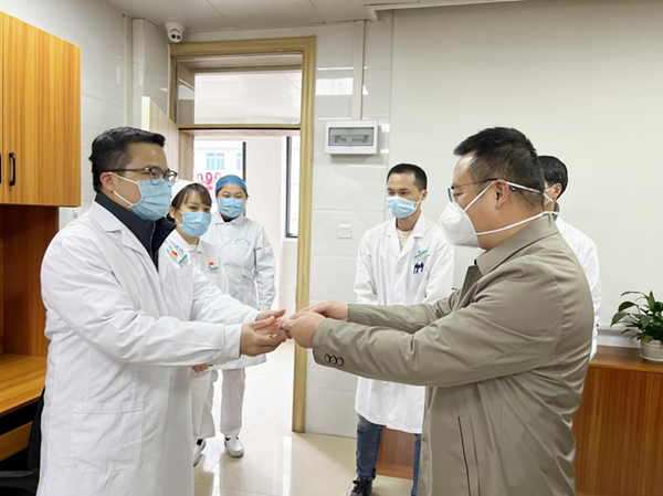 “新年好,大家辛苦了!”院领导分为9组,分别来到住院病区、手术室、医技楼等区域,与正在岗位上辛勤工作的一线医护人员握手交流,表达诚挚问候。