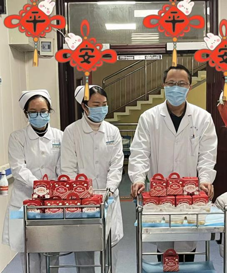 2月5日是我国传统团圆佳节元宵节,吃“汤圆”是元宵节传统,蕴含着团团圆圆的美好寓意。我院神经内科全体医护人员推着小车挨个为住院患者送上一碗热腾腾的汤圆和香甜的苹果,并向患者及家属致以节日的问候,祝愿患友们早日康复、平平安安。
