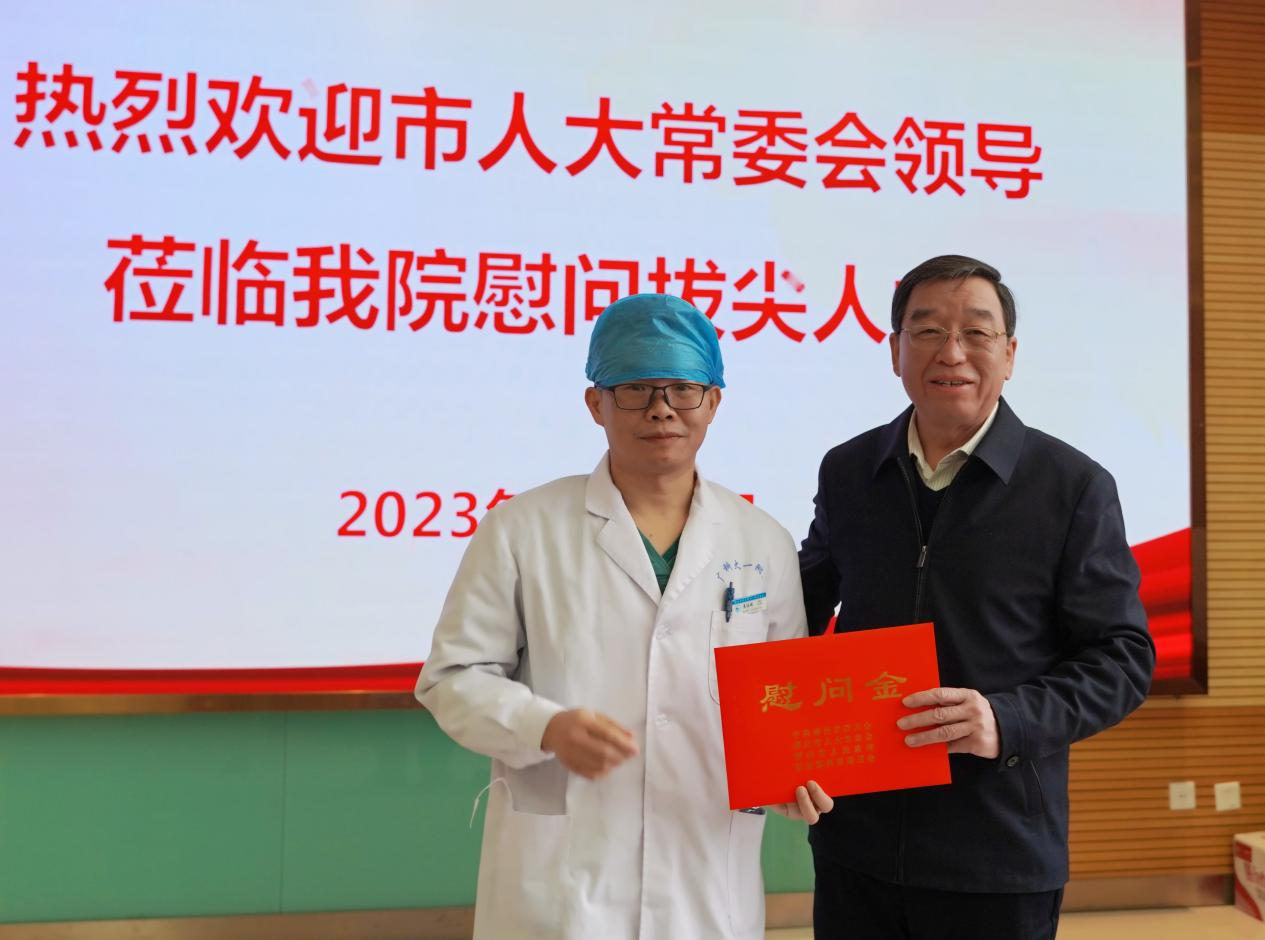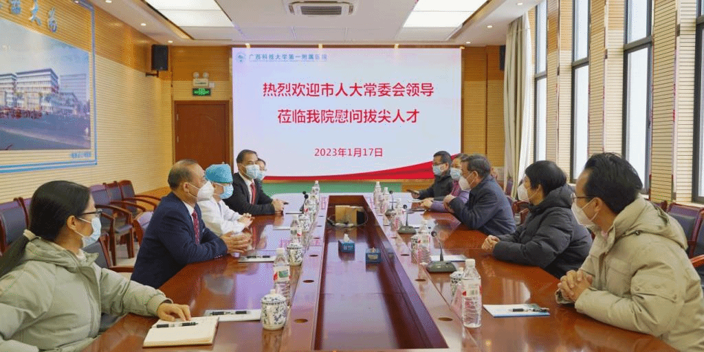 为进一步贯彻落实中央、自治区人才工作会议精神,近日,柳州市人大常委会副主任、党组副书记、市总工会主席梁日春带队前往广西科技大学第一附属医院,看望慰问入选柳州市第十四批拔尖人才的该院麻醉科副主任吴运斌。一同前往的领导有柳州市人大常委会副秘书长刘榴、柳北区人大常委会主任莫朝晖、柳北区人大常委会副主任杨帆,本院党委书记庞晓红、党委副书记、院长覃天等院领导参与慰问。