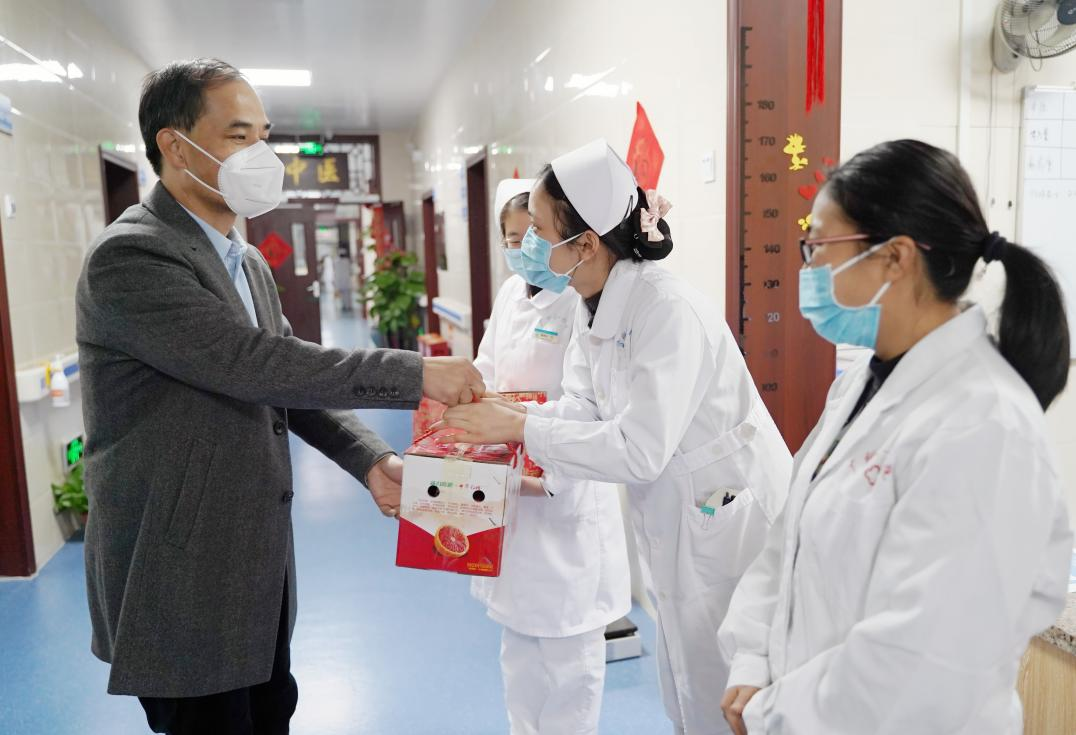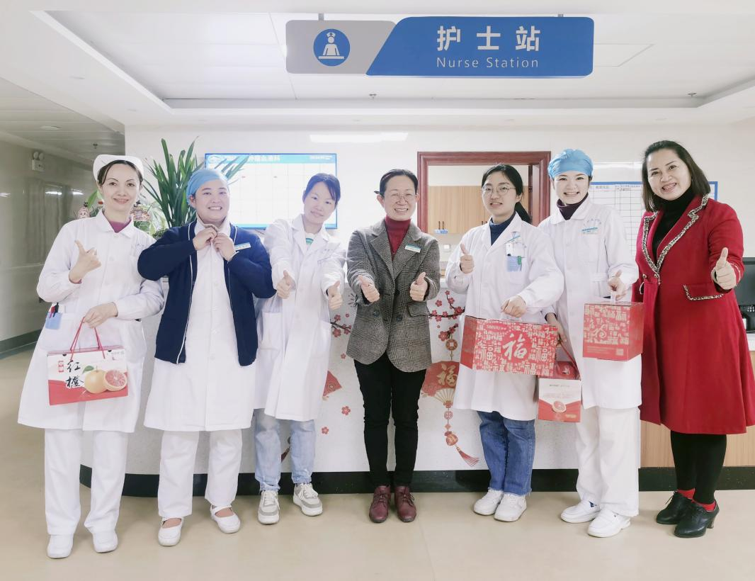 专家们在医院的工作生活是否顺利?也是医院领导挂心的一件大事,在兔年新春来临前,院党委书记庞晓红、党委副书记何曲波特意来到刚到柳州的尼日利亚籍博士Daniel Iroegbu,给他送去了柳州本土的特色水果,询问了他的生活情况并介绍了中国传统春节的习俗,祝福他在中国度过一个快乐年,尽快融入医院的工作环境。