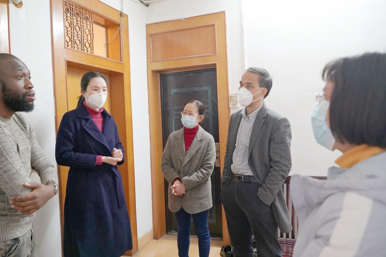 党委书记庞晓红(中)、党委副书记何曲波(左三)慰问尼日利亚籍博士Daniel Iroegbu