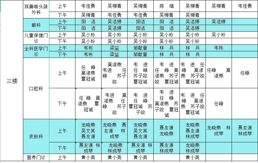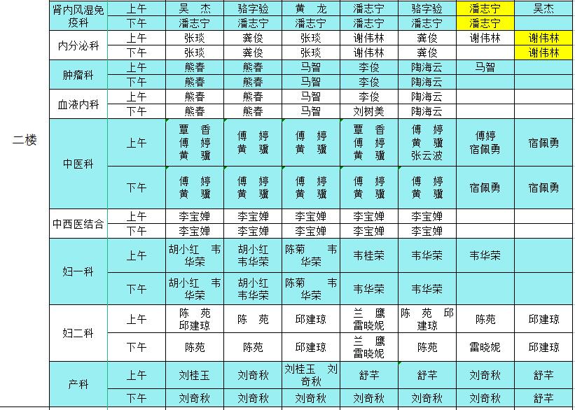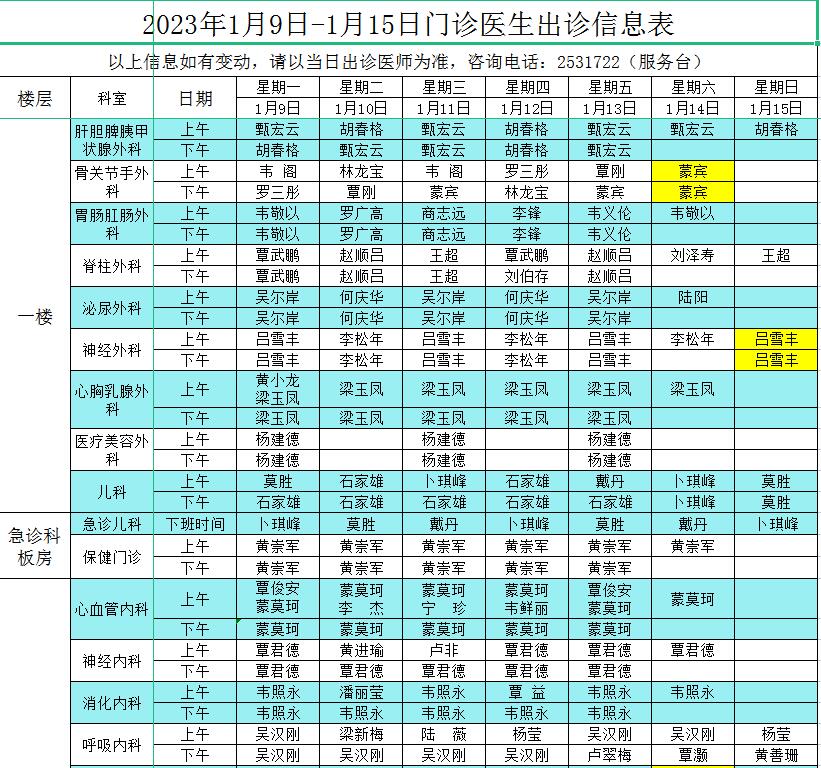 2023年1月9日-1月15日门诊医生出诊信息表