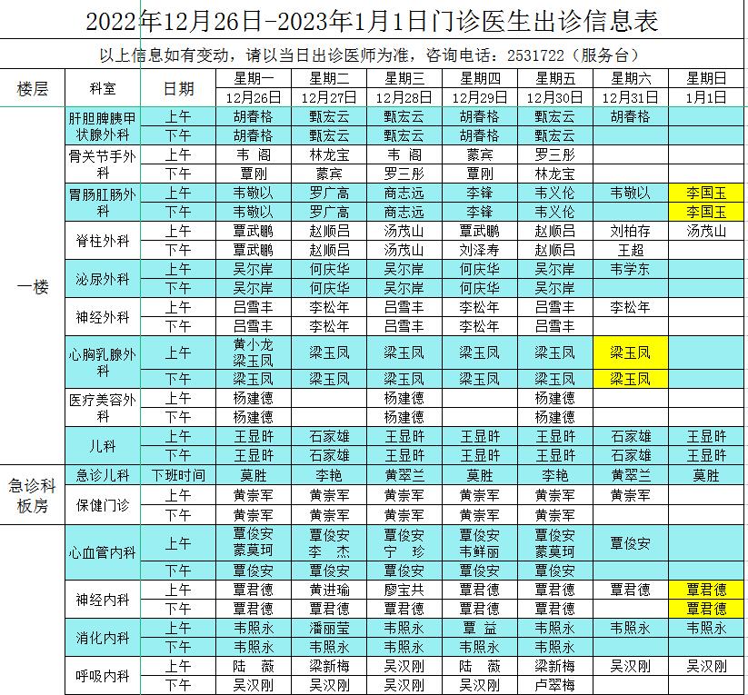 2022年12月26日-2023年1月1日门诊医生出诊信息表