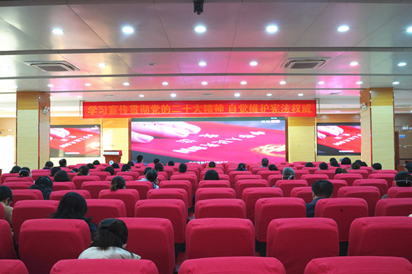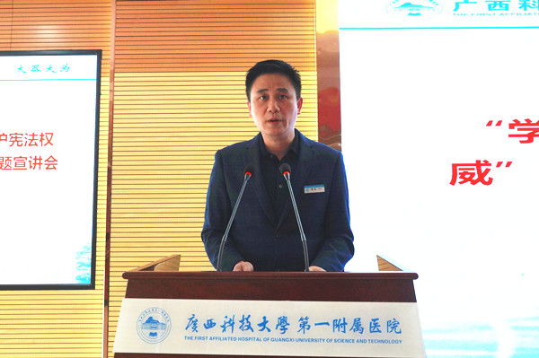 2022年是中国共产党第二十次全国代表大会召开之年,今年的12月4日是我国第九个国家宪法日,也是现行宪法公布施行四十周年,学习宪法精神具有极其重要的意义。12月13日下午,广西科技大学第一附属医院在医院学术报告厅举办“学习宣传贯彻党的二十大精神, 自觉维护宪法权威”暨我国现行宪法公布施行四十周年主题宣讲,邀请柳北区人民法院立案庭副庭长、三级法官张禄敏作为主讲人。医院党政班子领导出席,医院纪委书记潘旭致辞,各党支部书记、中层干部和护士长等近100人参加会议。