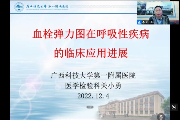 2022年12月4日,由广西科技大学第一附属医学检验科主办的自治区级继续医学教育项目--《出凝血检验与临床应用新进展学习班》成功在医院学术报告厅以线上授课的形式举办。医院副院长闭雄杰致欢迎词。学习班由医学检验科主任主持开幕式。