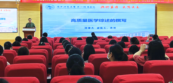 2022年11月23日下午,广西科技大学第一附属医院开展“高质量医学综述的撰写”主题讲座。医院副院长、教授、硕士生导师闭雄杰受邀主讲,330多名师生职工参加讲座,讲座由科研科科长梁明燕主持。