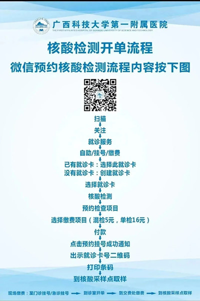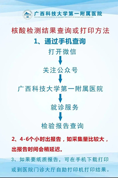 请先提前关注“广西科技大学第一附属医院”微信公众号申领核酸检测二维码,也可在上述公众号查询核酸检测结果。请广大群众注意此次调整,我院将继续秉承为民服务的理念,做好核酸采样及检测相关工作。