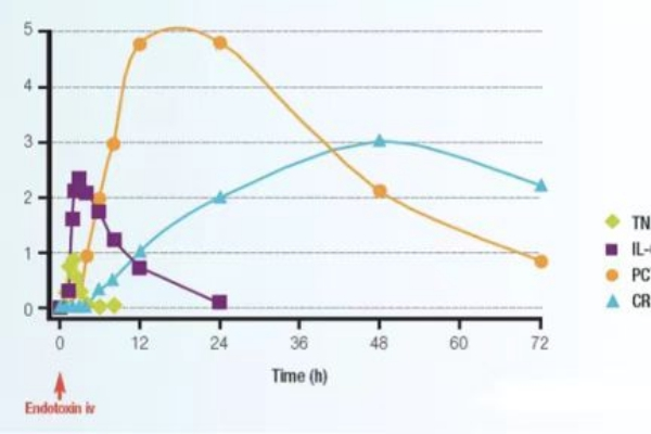 PCT 在血浆中存在时间短,半衰期为 22 ~ 29 小时,在体内外稳定性好,不易被降解,而且 PCT 的检测不受临床用药的影响 (OKT3 除外),与机体感染的严重程度呈正相关。因此,动态观察血浆中 PCT 浓度的变化能更好地判断预后和疗效观察,PCT水平下降表明炎性反应的降低及感染灶的清除,提示良好的预后。而 CRP 相对而言半衰期较长,恢复至正常水平所需时间较长,不适于预后和疗效的观察。
