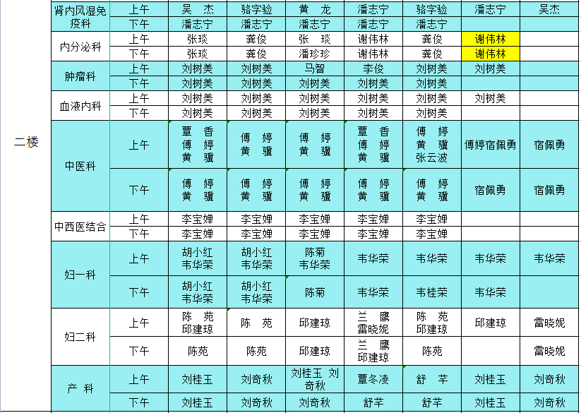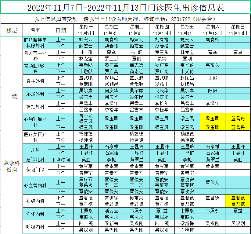 2022年11月7日-11月13日门诊医生出诊信息表