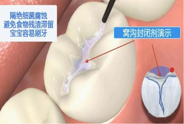 什么是窝沟封闭?绝大多数小朋友在6-7岁会迎来自己的第一颗恒牙,即第一恒磨牙,俗称“六龄牙”。六龄牙咬合面并不光滑平整,而是存在许多如沟壑深谷般的结构,即窝沟点隙。窝沟点隙是常规刷牙难以清洁到的部位,加之小朋友尚未养成科学规范的口腔保健习惯,许多家长误以为其是乳牙还会替换而常常忽略,因此六龄牙窝沟点隙是龋齿高发部位。六龄牙窝沟封闭是针对已完全萌出但尚未发生龋坏的磨牙,在无创条件下,用高分子材料将深的窝沟点隙填平,如同为六龄牙穿上了保护外衣,使之咬合面变得易于清洁,有效降低了患龋率。