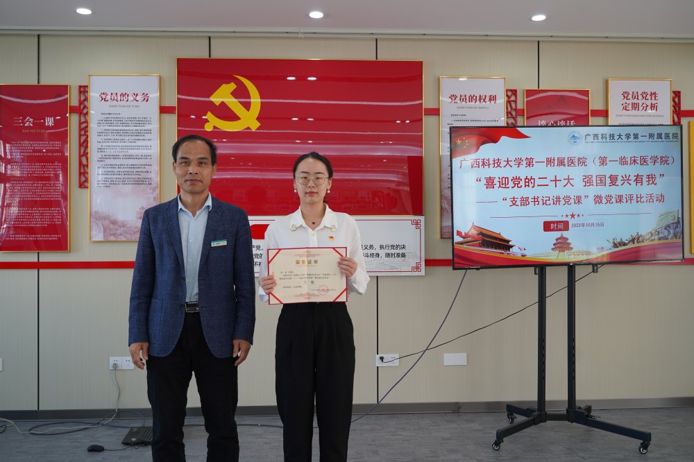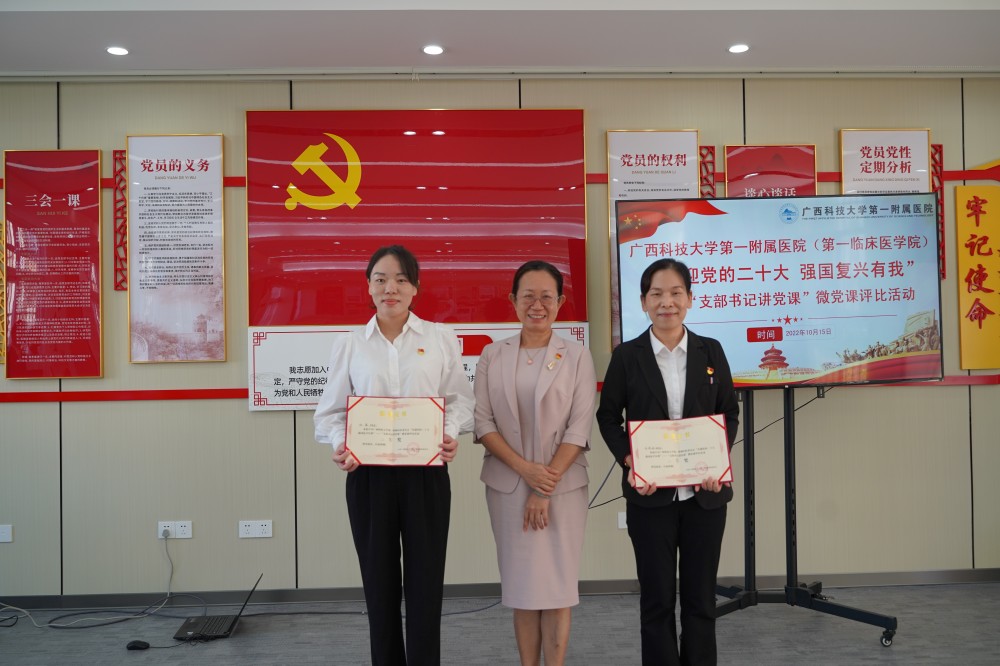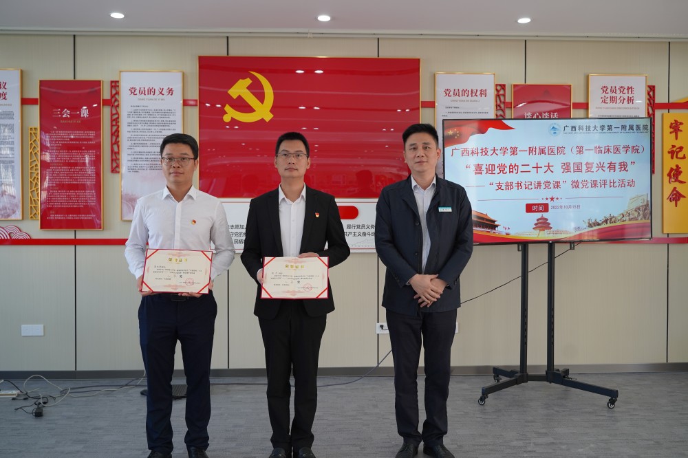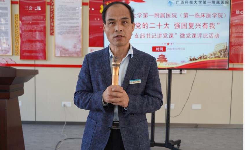 “强国复兴有我、有你、有大家!”10月15日上午,中共广西科技大学第一附属医院(第一临床医学院)委员会“喜迎党的二十大 强国复兴有我”——“支部书记讲党课”微党课评比活动在医院党建活动室拉开帷幕。院党委书记庞晓红、党委副书记何曲波、纪委书记潘旭等院领导出席活动并做评委,来自医院(学院)24个党支部的支部书记,讲感想、谈心得、表决心,赛出了风格、赛出了水平,展示了我院基层党组织建设的成果、成效。