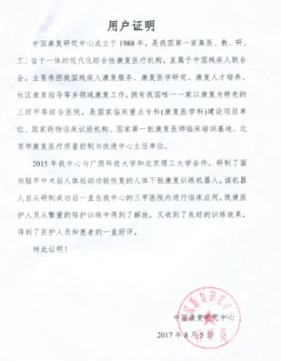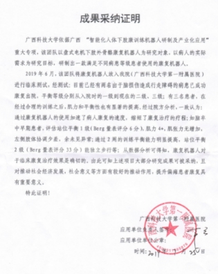 康复机器人的研发是我校医工融合的新突破,第三代下肢康复机器人集可移动性、平衡减重系统、自动化智能控制为一体,在一定程度上能够给予患者全关节支撑、多向限位保护、正确步态引导以及合理发力辅助,为脑卒中偏瘫患者站立平衡等级2级及以上患者提供安全、可靠、精准、高效的康复训练。下图为中国康复研究中心与广西科技大学第一附属医院对本团队脑卒中康复机器人的试用证明。