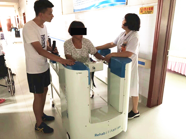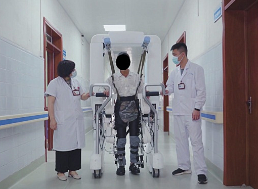 目前的临床试用顺利进行,第三代下肢康复机器人充分考虑到脑卒中或脑外伤患者早期躯干控制不稳定,下肢肌力较差,在结构设计上着重体现承载性能,通过智能动态低惯性减重单元为不同的患者提供减重训练方案,在充分保障患者训练安全的同时为患者提供基于真实地面的行走康复训练。下图1位试用者表示:“这个康复机器人非常好,可以帮我把膝盖弯起来,助力让我往前步行移动, 感觉很安全,一点都不用担心摔倒。”而另一位因大面积脑梗死患者尚不能独自站立及行走,因为有了下肢康复机器人的帮助而实现了“太空漫步”。患者及家属感到神奇和惊喜,对今后的康复充满了信心和希望。
