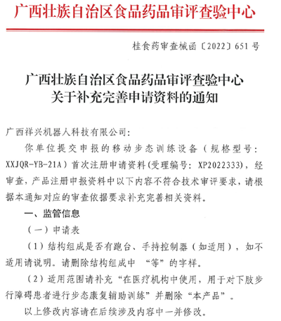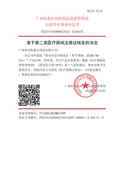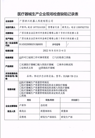 下肢康复机器人质量体系建设获得广西壮族自治区食品药品审评查验中心核查通过,近期获得了国家二类医疗器械注册证与生产许可证。