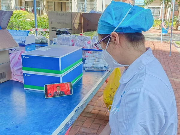 核酸采样队员在休息时间观看直播