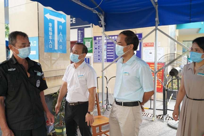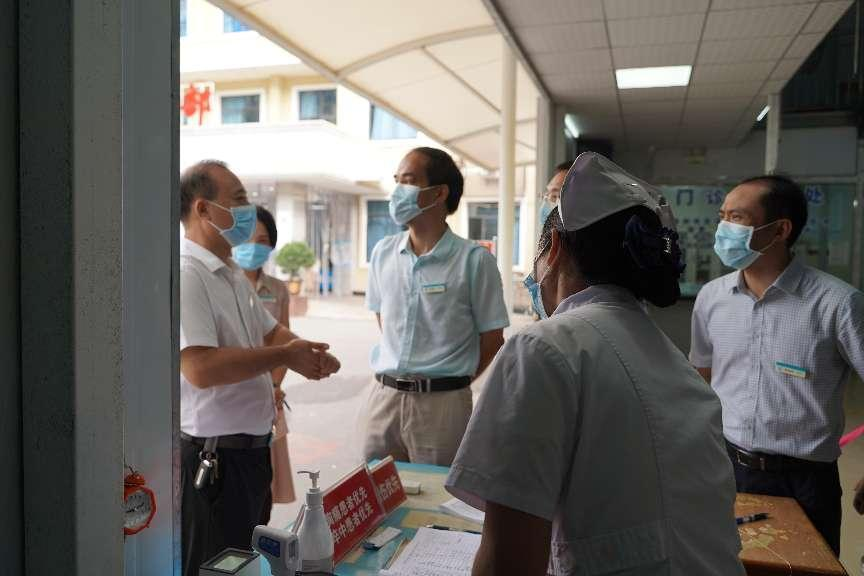 党委书记庞晓红(中)、党委副书记、院长覃天(左二)检查医院门岗情况