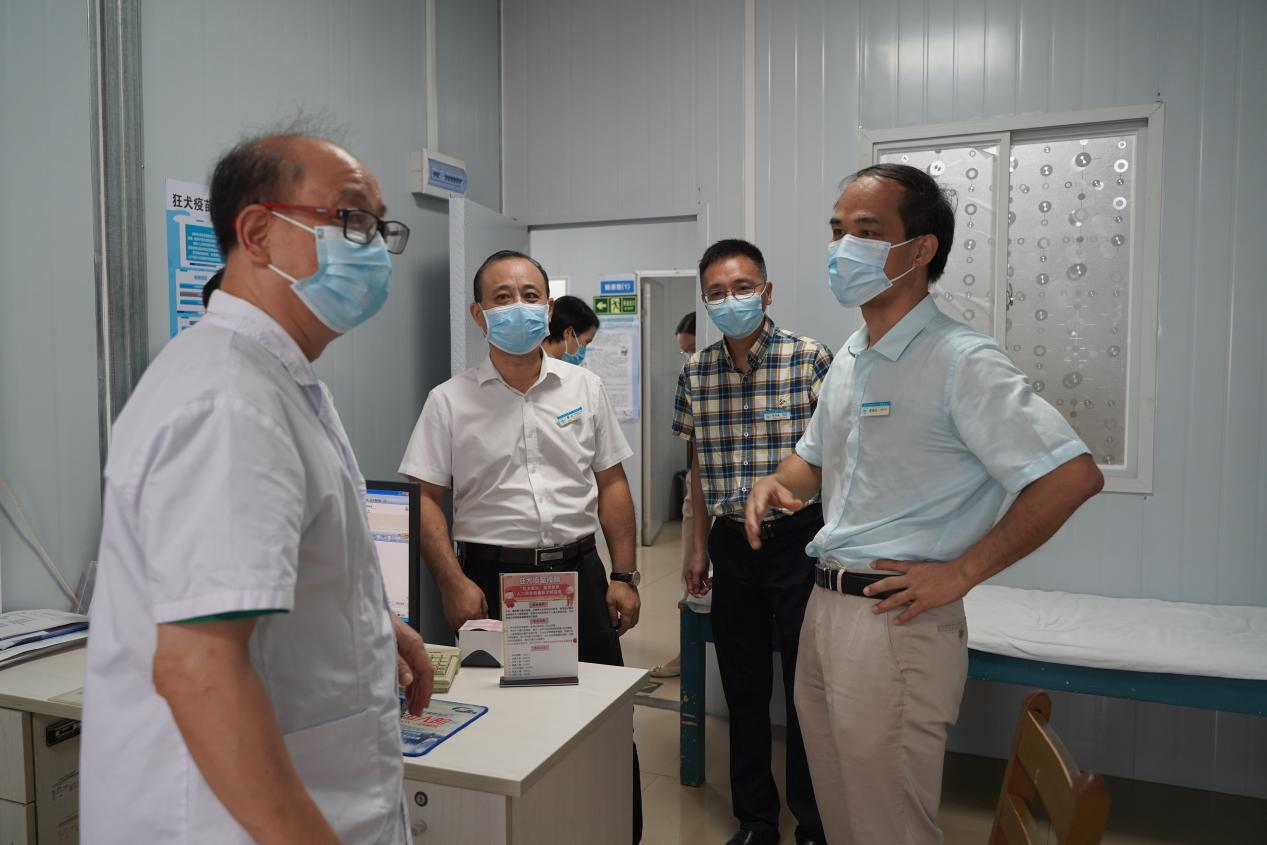 党委书记庞晓红(中)、党委副书记、院长覃天(左一)、副院长张施明(右一)检查急诊门岗并慰问医务人员
