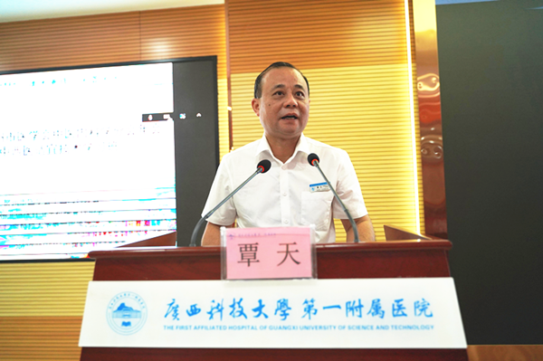 首先,医院党委副书记、院长覃天致辞。他介绍了医院的基本情况和最近发展趋势,以及中医科今年来所获成绩,并对各位参会代表表示热烈欢迎。希望以此次学术交流活动为契机,共同促进中医科的繁荣发展。