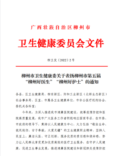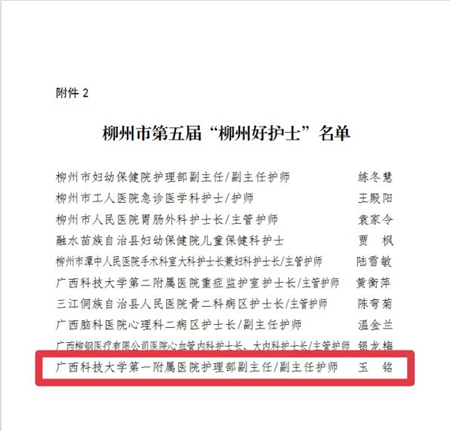 近日,备受关注的柳州市第五届“柳州好医生”“柳州好护士”评选结果于2022年9月14日揭晓。广西科技大学第一附属医院护理部副主任玉铭,荣获“柳州好护士”荣誉称号。