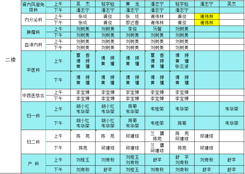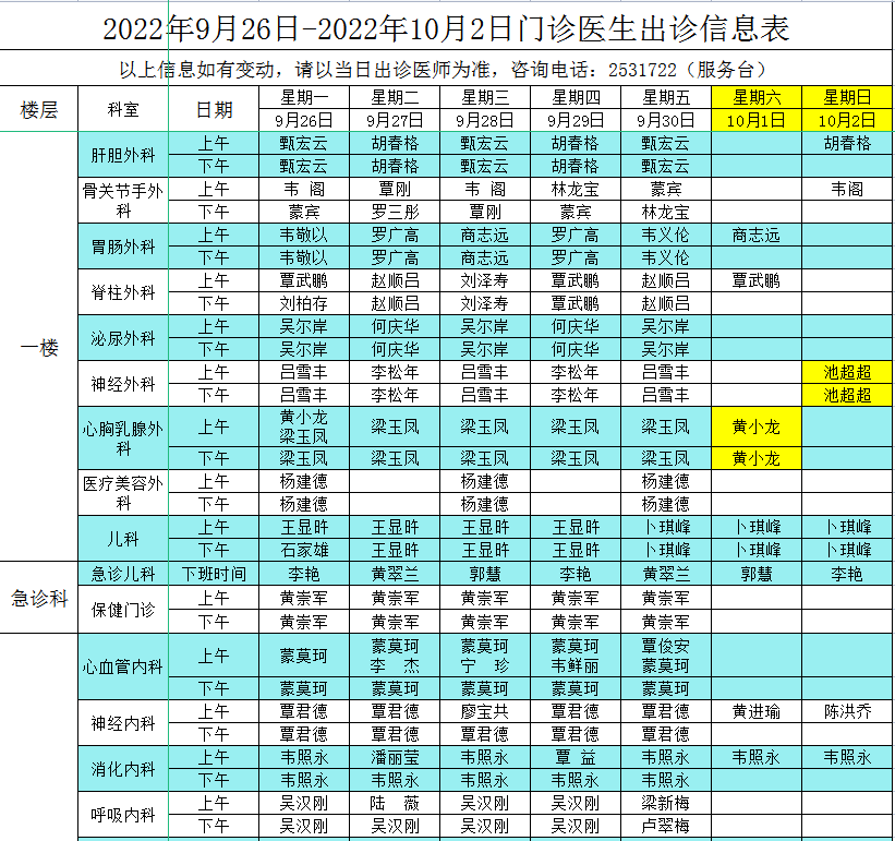 2022年9月26日-10月2日门诊医生出诊信息表
