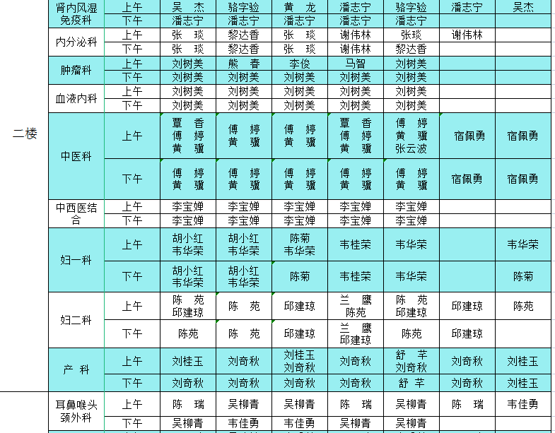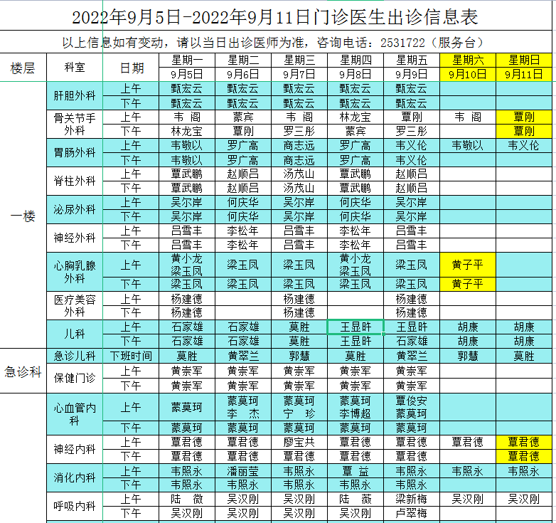 2022年9月5日-9月11日门诊医生出诊信息表