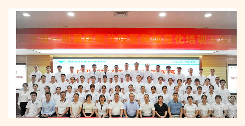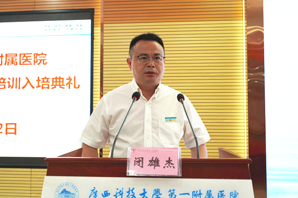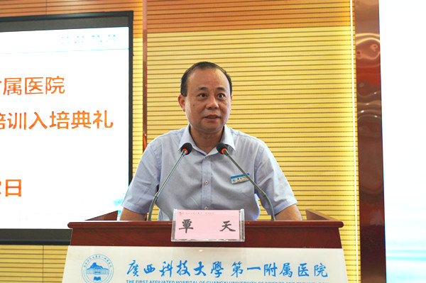 入培典礼上,覃天院长致辞。覃院长首先代表医院欢迎各位学员来我院参加住培!接着介绍了我院发展的历史和文化传承,介绍了我国住院医师培训的历程。同时表示医学教育是精英教育,医生的培养周期是漫长而艰辛的,希望学员能够做到以下两点:一、学会坚守和坚持,选择了医学,等于选择了奉献。希望学员在住培三年时间里,牢记初心和医学使命,不怕辛苦,勤学苦练,以救死扶伤为己任。二、坚持学习,医学领域浩瀚无边,知识更新日新月异,希望我们的学员不断追求,不断学习,学习新的诊疗规范和诊疗指南,及时更新知识。希望学员在住培的三年里,在我们广科大第一附属医院书写出第一篇华丽的乐章!