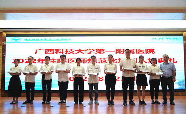 8月22日上午,广西科技大学第一附属医院在学术报告厅举行了2022年住院医师规范化培训入培典礼。医院党委副书记院长覃天、副院长闭雄杰、副院长张施明、总会计师向桂云及相关职能部门负责人、各专业基地主任、教学主任、教学秘书和2022级全体住培学员约100余人参加了典礼。入培典礼由分管住培工作的副院长闭雄杰主持。